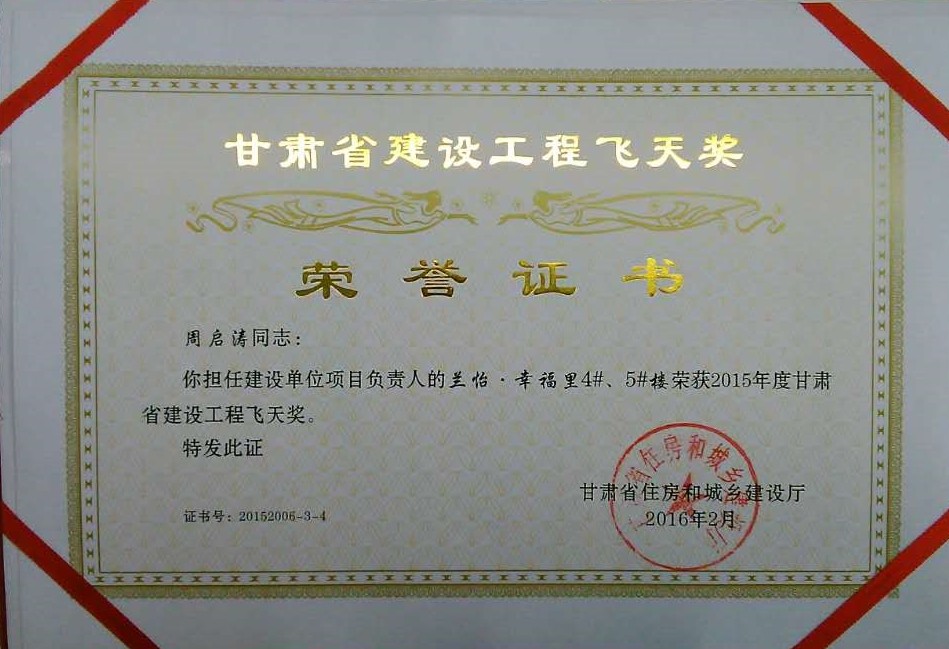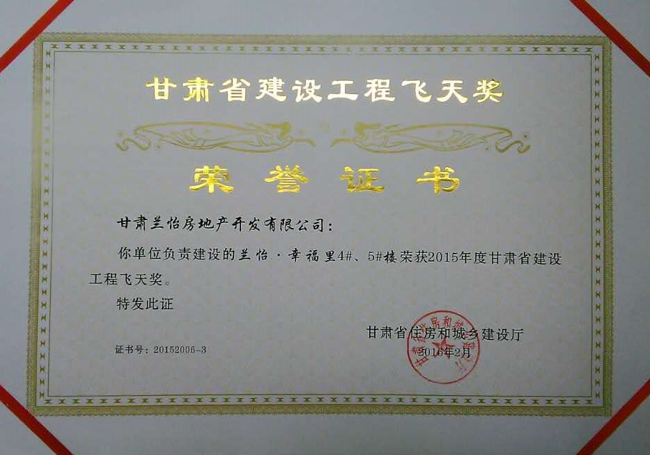 2016年2月5日,由甘肃省住房和城乡建设厅评选的2015年度甘肃省建设工程“飞天奖”对社会各界发布,本次共发布41个“飞天奖”项目。其中,由甘肃中集实业集团子公司甘肃兰怡房地产开发有限公司开发建设的中集·幸福里凭借高品质的开发标准,喜获甘肃省2015年度建设工程“飞天奖”荣誉称号,成为兰州市安宁区唯一获此殊荣的项目。