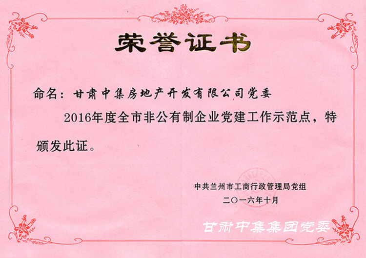 2017年10月10日,由兰州市工商行政管理局评选的2016年度全市非公有制企业“党建工作示范点”面向全市发布,甘肃中集房地产开发有限公司党支部喜获全市非公有制企业“党建工作示范点”殊荣并获得由兰州市非公委补贴党建专项经费20000元。