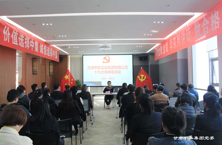 11月23日下午,甘肃中集实业集团有限公司党委在公司党建活动室开展党的十九大精神专题教育活动,公司党委书记、董事长周启涛代表集团公司党委,以《深入学习党的十九大精神,建设美好幸福新兰州》为主题,向公司全体党员、入党积极分子、集团公司各版块及各部门负责人宣讲党的十九大精神。
