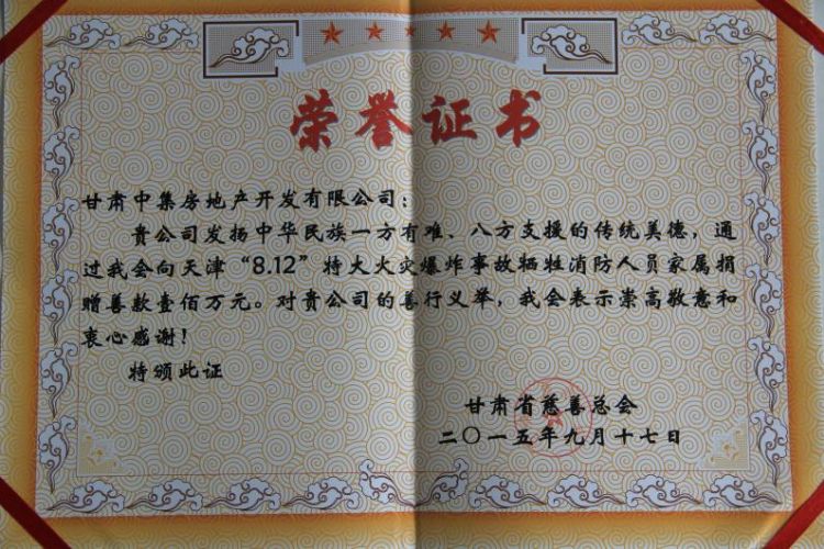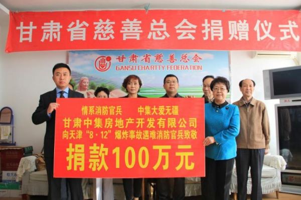 2015年9月17日上午,甘肃中集房地产开发有限公司总经理周启涛亲自前往甘肃省慈善总会,将100万元善款交给甘肃省慈善总会,委托甘肃省慈善总会转交给天津市慈善协会,并由天津市慈善协会将善款交由天津市消防部门发放至参加天津港“8.12”事故救援遇难消防官兵家属。捐赠仪式上,杜颖会长代表甘肃省慈善总会接收捐款并对中集房地产开发有限公司的善行义举给予了充分肯定:“慈善事业是充满人性光辉、体现人间大爱、尊崇高尚美德的事业。中集房地产开发有限公司今天的捐赠体现了一个企业的高度责任感和崇高的道德境界,并一定会以此带动社会各界及更多的人们关注慈善、参与慈善”。