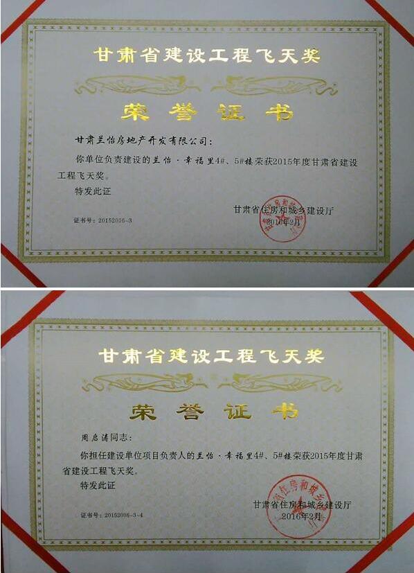 2016年2月5日,由甘肃省住房和城乡建设厅评选的2015年度甘肃省建设工程“飞天奖”对社会各界发布,本次共发布41个“飞天奖”项目。其中,由甘肃中集实业集团子公司甘肃兰怡房地产开发有限公司开发建设的中集·幸福里凭借高品质的开发标准,喜获甘肃省2015年度建设工程“飞天奖”荣誉称号,成为兰州市安宁区唯一获此殊荣的项目。