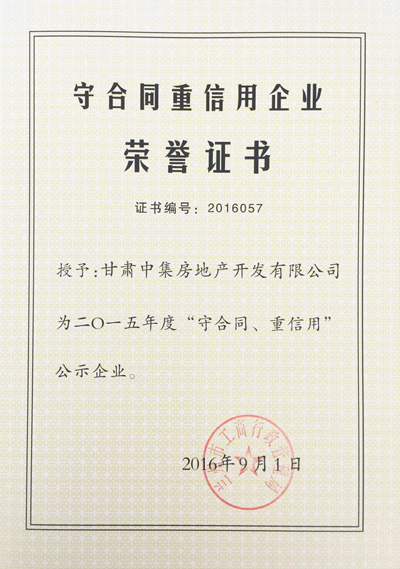 2016年9月1日,由兰州市工商行政管理局评选的兰州市2015年度“守合同重信用公示企业”对社会各界发布,本次全兰州市共发布88个“守合同重信用公示企业”。甘肃中集实业集团有限公司子公司甘肃中集房地产开发有限公司凭借“重诚信、谋发展”的经营发展模式,喜获兰州市2015年度“守合同重信用公示企业”荣誉称号,为甘肃中集集团发展里程再添辉煌。