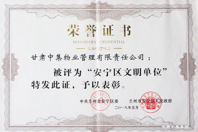 甘肃中集物业管理有限责任公司被兰州市安宁区委、安宁区人民政府联合授予“文明单位”..