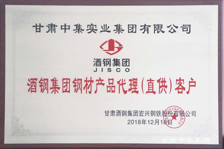 热烈祝贺甘肃中集实业集团有限公司荣获酒钢集团“2018年度金牌代理商”殊荣