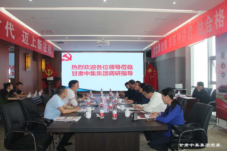 2019年5月21日上午,山西省非公经济组织和社会组织工委副书记、市场监管局党组成员、副局长王国强,山西省市场监管局非公党建处处长朱志东一行6人,在省委非公经济组织和社会组织党工委副书记、甘肃省市场监管局党组成员、副局长肖建胜,甘肃省市场监管局非公经济组织党建工作处处长刘玉圣,兰州市市场监督管理局党组成员、副局长李继军,安宁区市场监督管理局党组成员、副局长苏润彬陪同下莅临集团党委调研非公企业党建工作,集团公司党委书记、董事长周启涛携集团公司党委委员向参观调研组汇报企业党建工作。